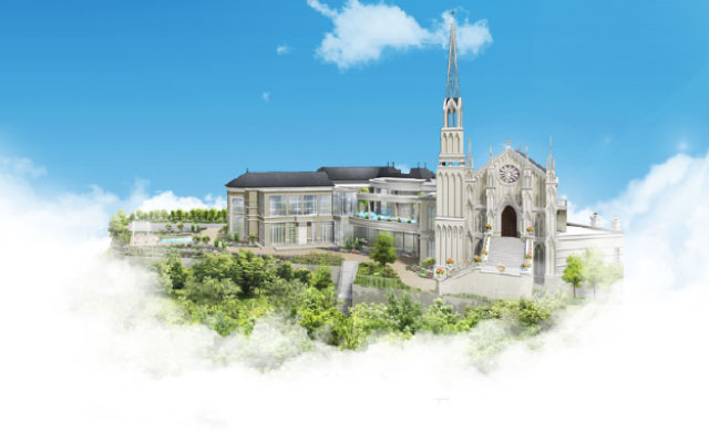 レースの天井装飾やステンドグラスからのやわらかな光の中永遠の誓いをたててみては?